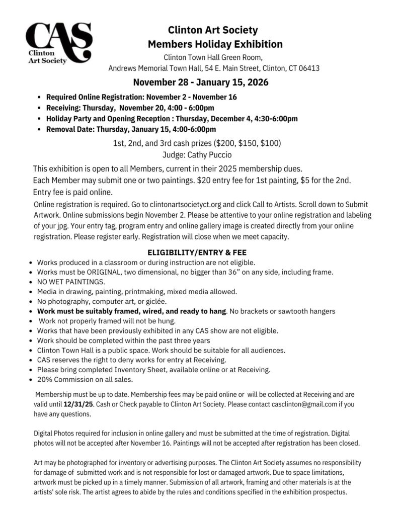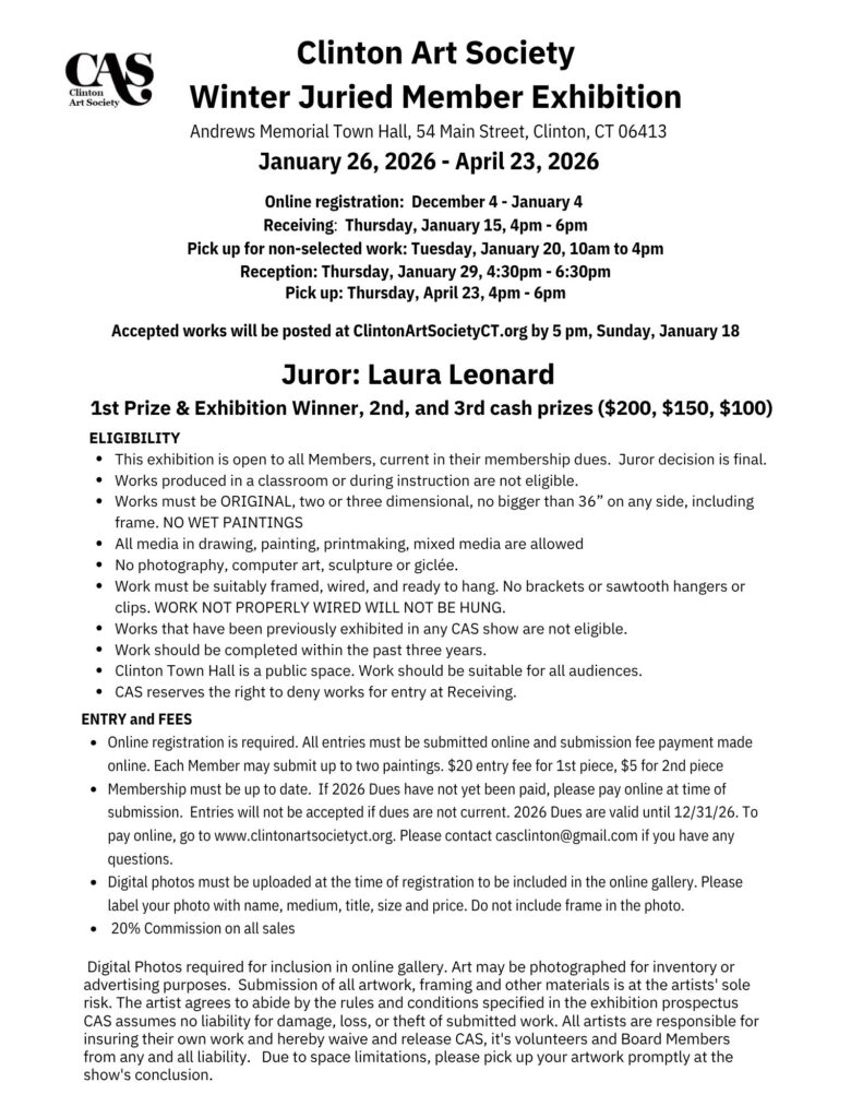 Clinton Art Society assumes no liability for damage, loss, or theft of submitted work. All artists are responsible for insuring their own work and hereby waive and release CAS, its volunteers and Board Members from any and all liability. Due to space limitations, artwork must be picked up promptly at the show’s conclusion. If you cannot pick up your work on the pickup date, you must arrange for someone else to pick it up.